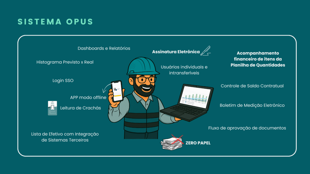 Com o sistema Opus, todo o processo foi digitalizado: da criação dos relatórios pelo aplicativo até a aprovação final com assinatura eletrônica via plataforma web. As medições e os RDOs passaram a ser centralizados em um único ambiente online, com fluxo estruturado de conferência e validação.