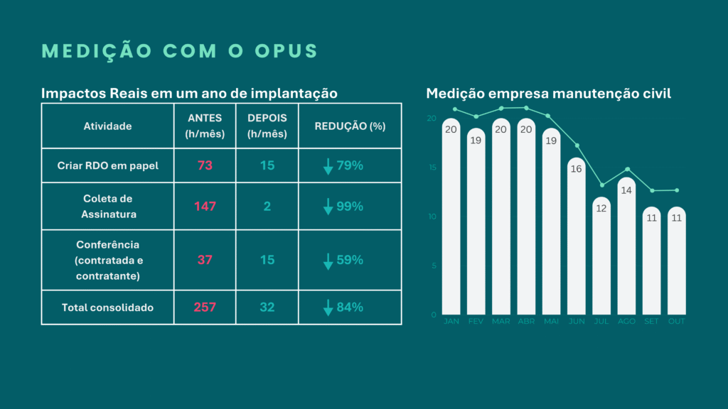Até a chegada do sistema Opus, o processo de Relatórios Diários de Obra (RDO) era totalmente manual. Ao final de cada mês, os dados sobre serviços executados, equipamentos utilizados e disponibilidade de mão de obra precisavam ser somados para gerar a medição.